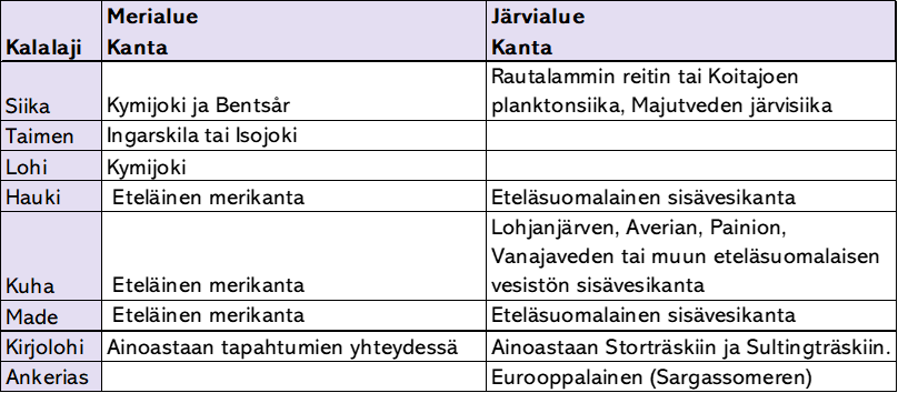 Käyttö- ja hoitosuunnitelman mukaan voidaan Helsinki-Espoon kalatalousalueen merialueen ja järvien istutuksissa käyttää taulukossa olevia kalalajeja ja -kantoja ilman erillistä VARELY:n lupaa. Lisätietoja meri- ja järvialueen istutuksista on käyttö- ja hoitosuunnitelman 2.4.3 ja 4.4.3 kappaleissa. Virtavesistöihin istutuksia tehdään vain perustelluista syistä, enemmän tästä käyttö- ja hoitosuunnitelman 3.4.3 kappaleessa.